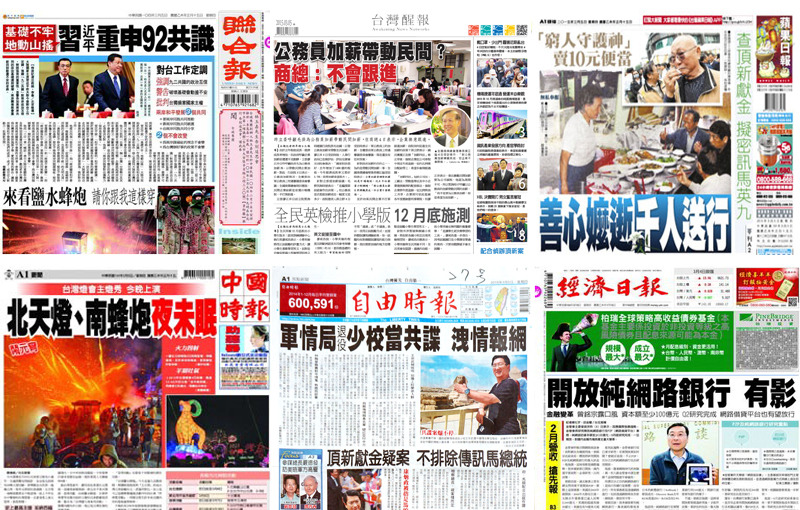 《聯合報》的頭條則是中國國家主席習近平重申92共識 ,並警告台灣莫重走動盪不安的老路;《中國時報》報導5日晚間熱鬧活動,北天燈、南蜂炮、中部台灣燈會的主燈秀都將登場;《蘋果日報》則報導在高雄港賣10元自助餐達50年、幫助碼頭工人的善心阿嬤逝世,近2000人到場送行;《經濟日報》的頭條則是金管會為因應國際發展趨勢,將研究開放純網路銀行及網路借貸平台等業務。