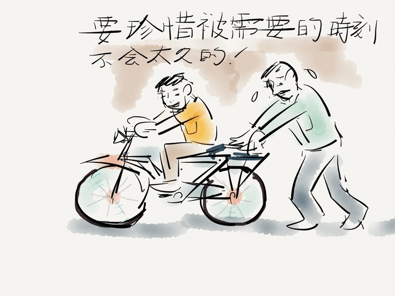 那次採訪完後,大家一齊牽了單車到練車伯伯家,裝出小孩口吻要他陪練。在公園那條小路上,所有人笑著大喊「衝啊!」陪練車伯伯奔向他的晚年。幾年後在練車伯伯的喪禮上,就擺著我們跟他一起「練車」的黑白相片。那相片輪廓異常清晰,彷彿是一段抵抗歲月蛀蝕的記憶。