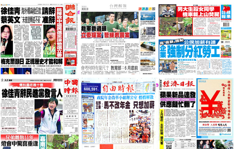 《聯合報》報導,民進黨主席蔡英文以「我們覺得不妥」,評論徐佳青沒有經過查證就轉述;《中國時報》則報導蔡英文認為徐佳青已逾越發言人角色,陳水扁之子陳致中則認為這是民進黨要逼他退選,所刻意放出的抹黑。《經濟日報》的頭條則報導蘋果新品連發,供應鏈忙不停。