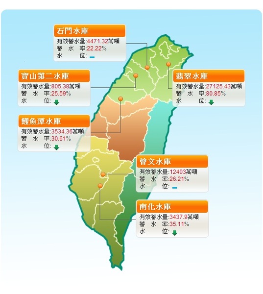 「目前全台供水情形並不樂觀。」鄧振中坦言,供水給新北市板橋、林口區,與桃園市的的石門水庫水情最為嚴峻。除了新北市林口、板橋,與桃園市外,鄧振中也指出,目前包括新竹、苗栗、彰化北部、台南及高雄地區都已實施第2階段限水,且部分竹科公司已開始買水因應。