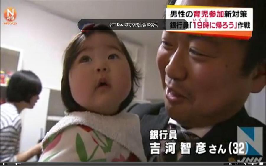 《TBS》報導指出,目前為止日本僅有2%的男性請過長期育嬰假,每天平均早上6點出門晚上10點回家,但最近不少企業開始鼓勵男性職員7時準時下班回家陪孩子,職場文化似乎開始改變。一位任職於有良好育嬰制度企業日本爸爸表示,公司瀰漫愛家的氣氛,男同事都樂於請假回家照顧孩子,而他也因每天要準時回家餵孩子吃飯、陪孩子洗澡,白天的工作效率反而變好。