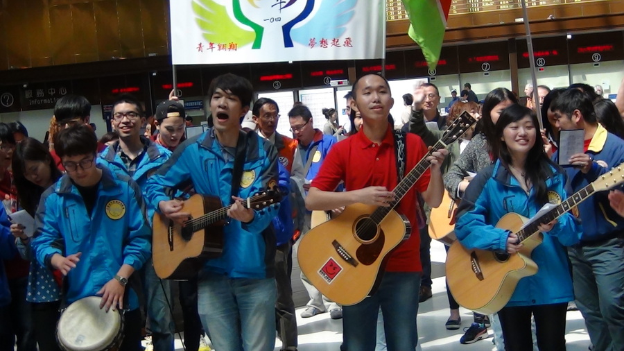 【台灣醒報記者王奕超台北報導】一群身著藍衣和紅衣的青年男女29日上午10點半,忽然集體現身台北車站大廳高聲合唱,領頭的2男一女,手持木吉他,在身著國旗裝的女子指揮下,帶領大家高唱〈台灣心跳聲〉、〈向前走〉等流行歌曲,活動最後在愛國歌曲〈碧血黃花〉的歌聲中作結,過程中吸引了不少路人圍觀、攝影,這是救國團為慶祝329青年節,在各地舉辦的歌唱快閃活動!