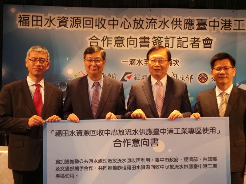 繼高雄鳳山溪污水回收廠成功供給穩定的再生水後,經濟部、內政部、交通部與台中市政府於30日簽訂合作意向書。福田水資源回收中心預計於109年擴建完成後,供應每日13萬噸經二次過濾及消毒處理的再生水給台中港工業區使用。