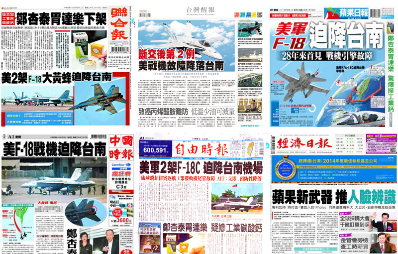 【台灣醒報記者鄭宇晴報導】美國海軍陸戰隊所屬2架F-18大黃蜂噴射戰鬥機,1日在台灣海峽執行任務時,其中1架疑因發動機尾管護罩脫落,緊急降落台南機場,成為《台灣醒報》、《蘋果日報》、《自由時報》與《中國時報》的頭版頭條。
