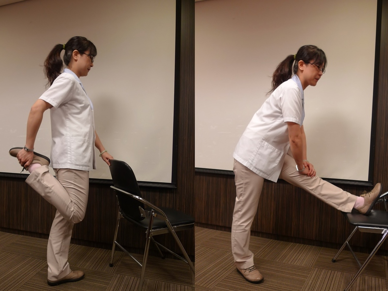 大腿肌群伸展運動也可舒緩腰痠背痛。要伸展大腿前側肌群,可雙腳微開站立,一手扶住椅背,一手由身後握住腳踝持續30秒,重複做3次為一回,左右交換各一回。大腿後側肌群的伸展,則可面對椅子站直,一腳踏穩地面,一腳膝蓋伸直放在椅子上,雙手置於膝蓋上方,肚子靠向大腿伸展腿後肌肉。有腰痠背痛困擾的民眾,不妨試做看看。