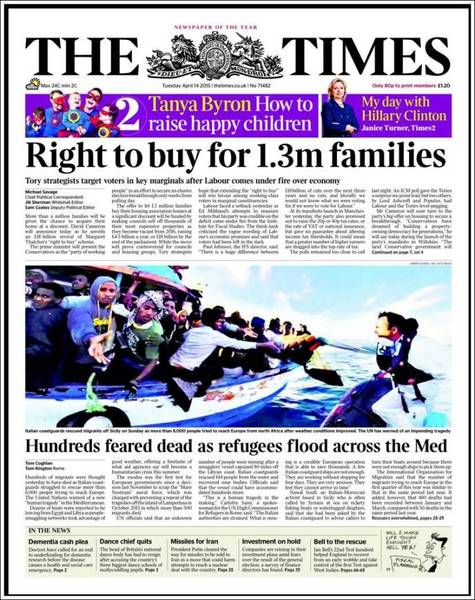 聯合國難民署發布,過去一週來有6千位難民從利比亞、敘利亞、厄利垂亞、索馬利亞、奈及利亞、甘比亞、埃及、馬利等國坐船橫越地中海,逃亡至義大利,超過40艘船艦參與救援。在這過程中有數百人不幸遇難,且難民中有大量的兒童與女性,甚至有不少新生兒。