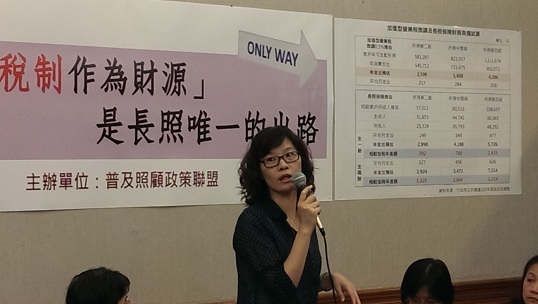 林綠紅建議長照財源該從遺贈稅及消費稅著手。而北大社工教授王品呼籲政府,未來老年人口膨脹,長照制度健全勢在必行。婦女新知基金會主任覃玉蓉則說,長照制度不只能預防老人失能,更能節省經費支出,將工作留在台灣。