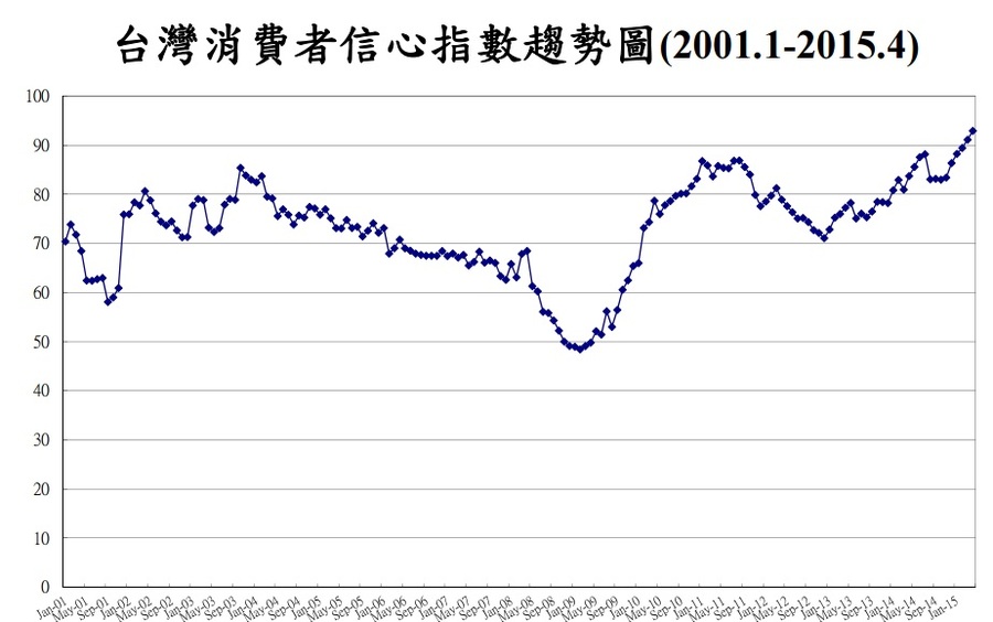 中央大學27日公布消費者信心指數(CCI)總數為92.93點,為100年1月調查實施以來信心指數最高,其中「未來半年投資股票時機」有46.4%受訪者答案選「是」,恰好與台股相呼應,該項指數也是6項信心指數中上漲最高的。本調查是每個月10日開始,當天台股已在9617點水準,去年同期台股只有在8700點水位。