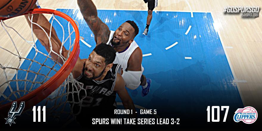 在2:2平局的關鍵第五戰中,馬刺已取得跨季7連勝。兩隊將於5月1日回到聖安東尼再戰,馬刺有機會在主場關門晉級。至於稍早另一頭的「德州內戰」,則已經由休士頓火箭4:1淘汰達拉斯小牛以逸待勞。馬刺若下場不能贏球,將回到洛杉磯與快艇進行第七戰,因此肯定會力拚6戰解決快艇,以留在德州整軍面對火箭的挑戰。