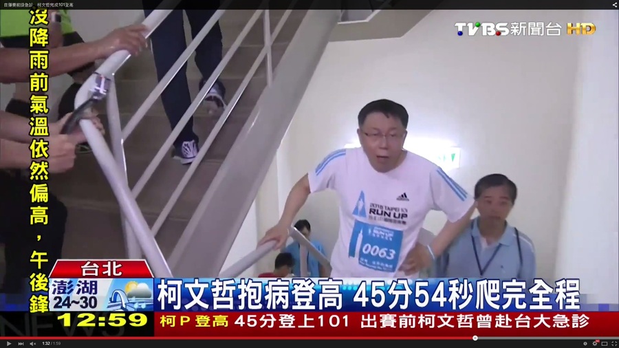 【台灣醒報記者游昇俯綜合報導】為了3日的101登高賽,台北市長柯文哲每天練爬從B2到11樓的市長室,但當天上午卻因身體不適,掛了急診,出了急診室回頭還是跑去參賽,最後以45分54秒完賽。台北101登高賽今年新增國內獎項,鼓勵國人運動風氣,各國駐台使節也來共襄盛舉,最後由波蘭和澳洲選手分別拿下男子及女子組冠軍。