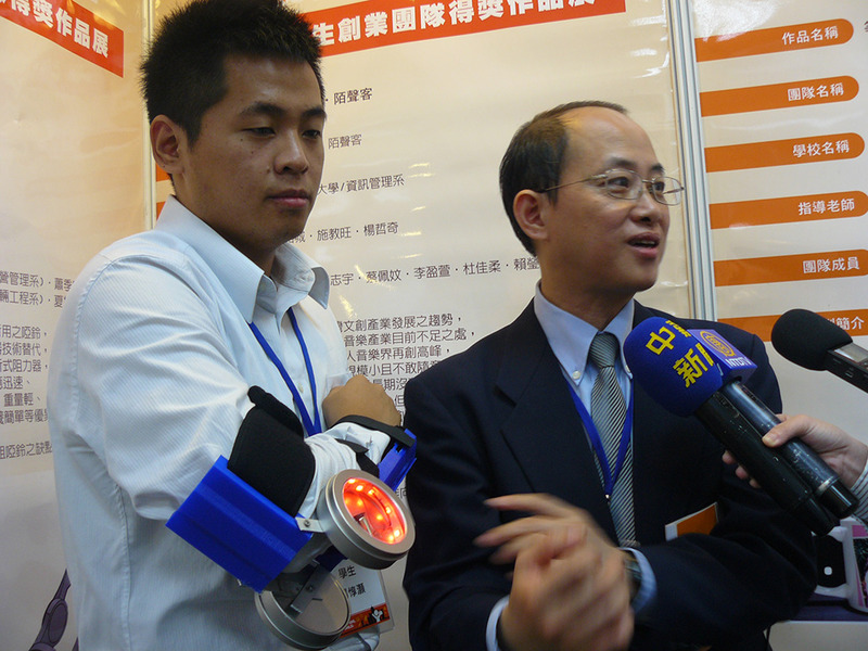 示範同學手臂戴上健力器宛如鋼鐵人的造型先吸引到眾人目光。此健力器利用團隊專利技術「磁流變液阻力器」來做為啞鈴訓練使用,隨著磁場增加、阻力變大,產生替代啞鈴重量負擔的效果。