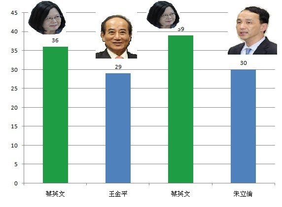 在較早發布的TVBS民調中,調查蔡英文分別與國民黨熱門參選人王金平、朱立倫和吳敦義進行參選對戰的民意支持度,結果發現,王金平以29%對上蔡英文的36%僅落後7%,朱立倫則以30%對上蔡英文的39%落後9%,吳敦義則以15%比47%大幅落後。