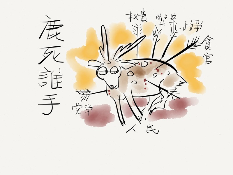 太遲了,是有位官員公子一馬當先,一箭射出,箭矢陷入小鹿身體時,還可聽見牠一聲驚呼。下一支箭緊接著來了,是部長寶刀未老,接著是市長、捲入弊案的幾個官員,然後是總統。最後是來城市裡作客的鄰近大國元首,用一記強而有力的射藝為逐鹿祭劃上完美句點。