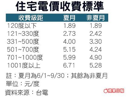 今天起至9月底實施較貴的夏月電價,除每月用電120度以下的240萬用戶不受影響,其他近950萬戶家庭,這4個月的電費都會增加,且用電愈多,電費增加也愈多,家庭平均每月用電330度,比非夏月貴約65元,用電500則貴約184元。