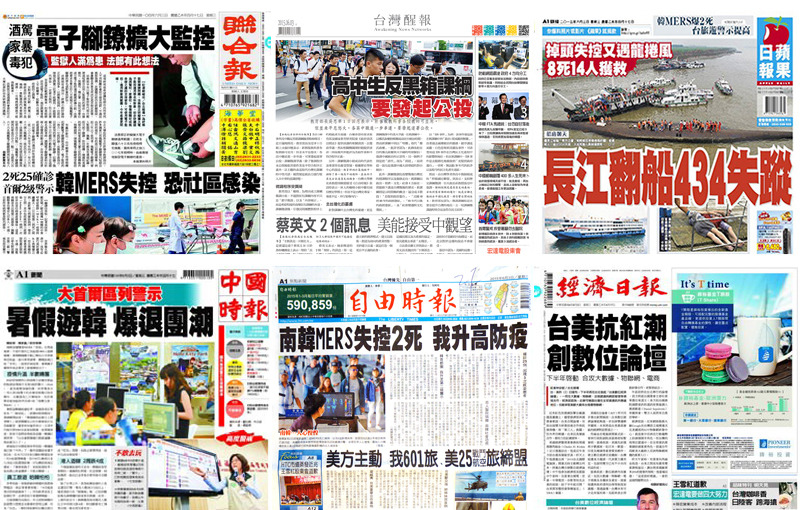 《自由時報》頭版頭條報導,MERS出現第2起死亡病例,並且新增6起確診病例,其中兩起屬於3次感染者;截至2日為止,南韓確診病例已達25例,3次感染患者的出現恐大幅導致更多人遭隔離。《中國時報》頭版頭條關注,南韓首爾MERS重挫台灣旅遊業,不到半個月已有超過2400人退韓國團,暑期韓國團半數已轉往日本和東南亞地區;旅行業者感嘆,韓國旅遊已經「半垮」。