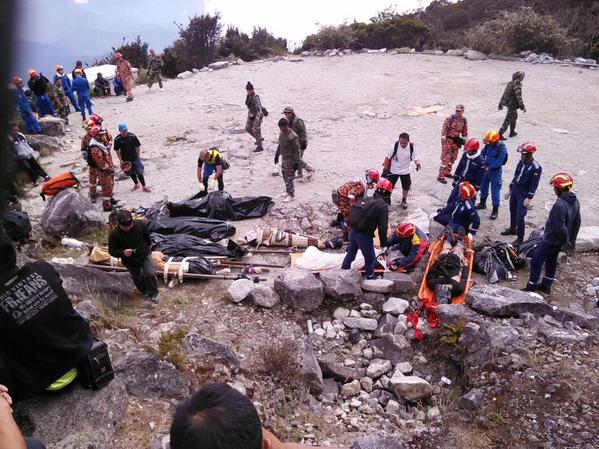《CNN》指出,馬來西亞當局派出超過400名搜救隊員,協助傷者下山,並且將救援道路上的巨石清除。而在此次災難中被譽為英雄人物的是一群當地的登山嚮導。事發當時,有大批登山客與遊客站在山頂,但因為下山的通道被巨石擋住而無法通行,飢寒交加的狀態下只能等候直升機救援。
