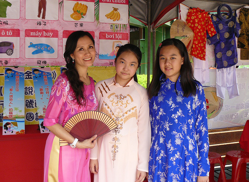 積穗國小的新住民媽媽則帶來母語闖關遊戲,分別以越南、印尼的文化特色出題由越南媽媽羅敏瑜(拉門優)主持越南語關卡,印尼媽媽王心如(黛莉)主持印尼語關卡;現場還展出越、印的傳統服飾與民俗木雕。