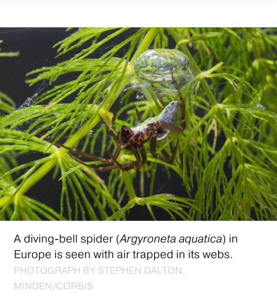 另一種水鐘蜘蛛,牠們將空氣存放在蜘蛛絲編成的氣艙中,科學家更發現,這個氣艙不只儲存空氣,它也像肺一樣,能從水中取得氧氣,讓蜘蛛得以在水下待上一天之久。