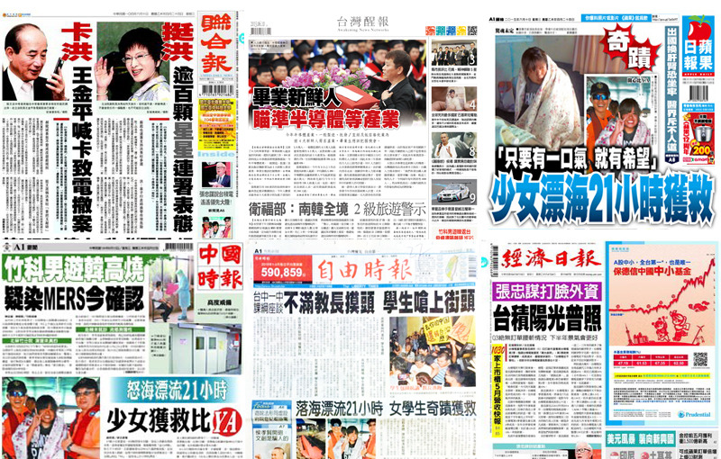 《中國時報》頭版頭條指出,在竹科工作的李姓男子,日前與家人到韓國自助旅行返台後身體不適,9日上午前往北榮新竹分院就醫,經X光片檢查發現他肺部浸潤。院方懷疑李男可能感染MERS,立即安排李男住進負壓病房隔離並採檢體化驗,最快10日中午前即可確認是否為MERS確診病例。