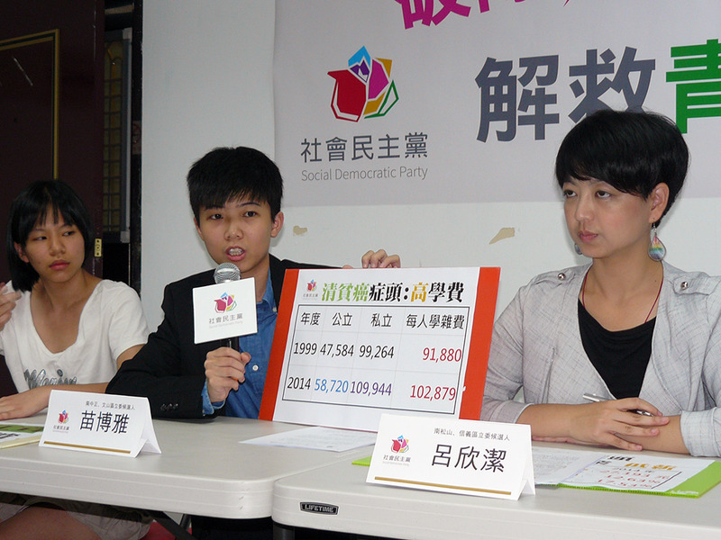 苗博雅提到,大學教育商品化下,使青年得負擔高額學費,102年畢業學生背負學貸的就占了21%,在進入職場前就平均背債44萬元。社民黨信義南松山立委參選人呂欣潔說,學費調漲但大學生起薪倒退,1998年15至24歲青年失業率7.3%,2014年卻已爬升到12.6%,「15至24歲是失業率最高的年齡層。」