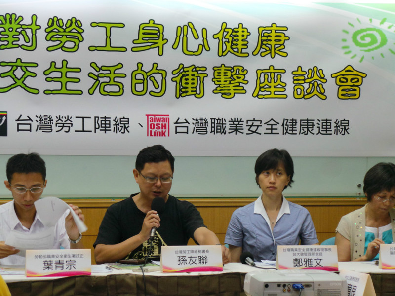15日「輪班制對勞工身心健康與社交生活的衝擊」座談會上,台灣勞工陣線先是提出各種台灣勞工深受輪班、夜班的困擾,並輔以醫學方面的專業指出,各種不當的工作狀態將造成身心理面的健康危害,特別是睡眠、癌症、工作意外及缺乏家庭生活與社會互動等。