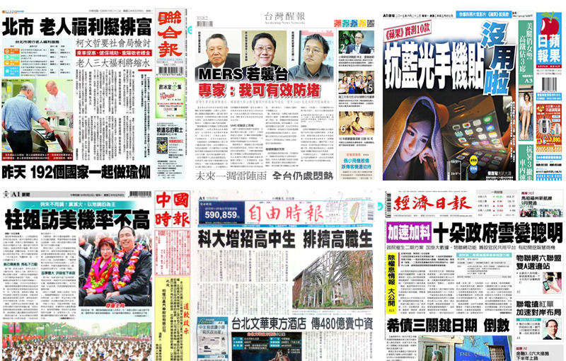 【台灣醒報記者張禹宣報導】防疫專家稱,若MERS來襲,台灣能控制疫情、有效防堵擴散成為《台灣醒報》22日頭版頭條。報導引述專家說法,台灣因有SARS的防疫經驗,如果台灣真的出現MERS病例,不會擴散,民眾不必過度恐慌。另外,台北市府正研擬老人福利政策的排富條款則為《聯合報》的頭版頭條。
