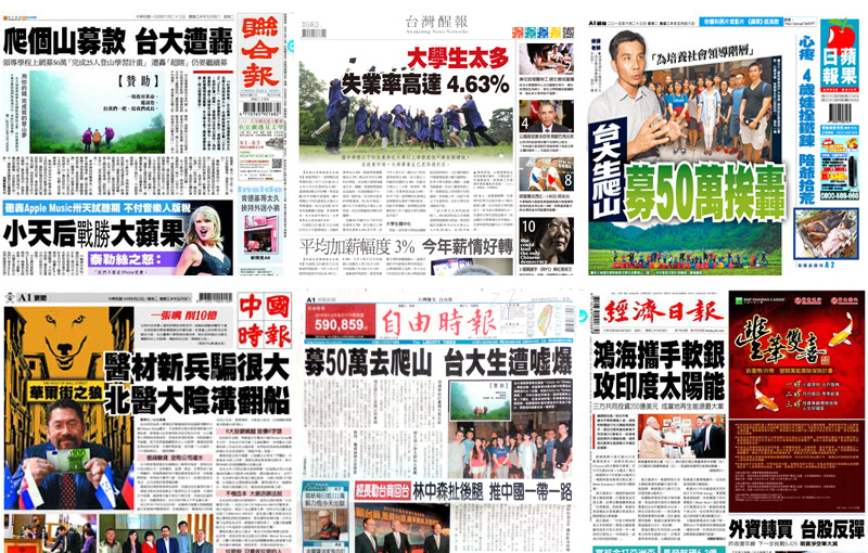《自由時報》頭版頭條指出,台大領導學程有25學生為爬南湖大山,在網路推贊助企畫「Climb for Taiwan」、向社會募款50萬元,遭網友噓爆,鄉民認為,小學生募款還懂得透過義賣,台大學生拿了國家這麼多資源,爬山卻還求贊助。《聯合報》引述台大領導學程副主任朱士維指出,爬南湖大山是課程的一部分,已有5、6年,重點是訓練團體合作和領導能力,今年他首次主動要求學生寫企畫募款,因募資「夠難」。
