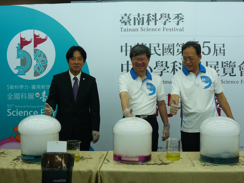 第55屆全國科展將於19到25日在台南一中及成功大學展開競賽,部長吳思華、台南市長賴清德7日與台灣科學教育館長朱楠賢、成大校長蘇慧貞一同出席全國記者會,介紹這次全國科展相關系列活動。他們還一同演示趣味的科學創意實驗,大玩「乾冰吹泡泡」,向大家示範科學教育可以簡單又有趣的理念。