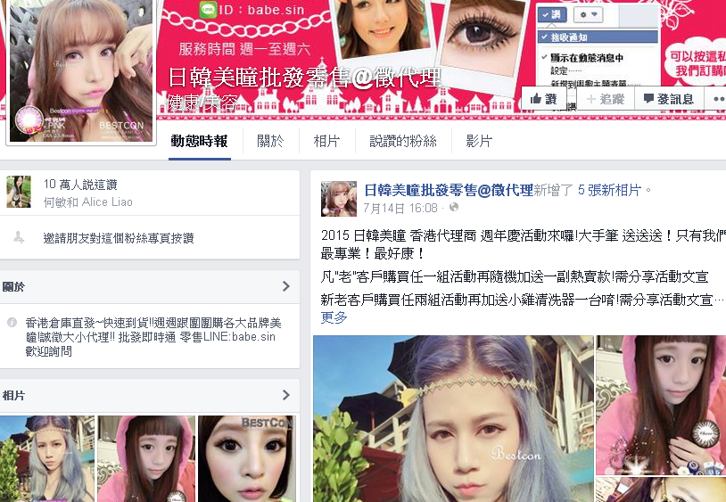 臉書粉絲團不能再兜售日韓隱形眼鏡了!北市衛生局開始查緝。(photo by「日韓美瞳批發零售@徵代理」臉書粉絲團)