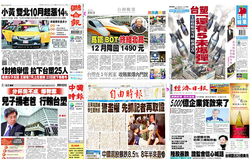 【台灣醒報記者余祥報導】台塑集團高階主管27日遭爆出集體收賄弊案,台北地檢署主動介入調查,成為《中國時報》及《蘋果日報》28日頭版頭條。另外,台北到高雄高鐵票12月降回1490元成為《台灣醒報》頭版頭條,報導指出,高鐵公司與交通部27日簽署增修協議,正式啟動高鐵財改方案,讓高鐵變成公有民營,除了降票價外,票卡12月起可正反兩面刷。