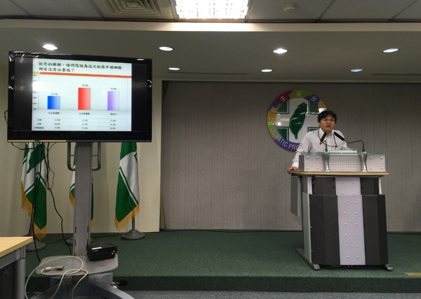 民進黨民意調查中心30日發佈一份針對學生團體反課綱微調行動支持度民調結果,調查發現,有40.4%的民眾認為這次高中新課綱微調沒有必要性,而認為有必要性的比例為23.7%。整體而言,有54.2%的民眾支持學生團體發起的反課綱微調行動,反對的比例是30.6%。比較特別的是,竟然有35.1%的泛藍選民支持學生發起的反課綱行動。
