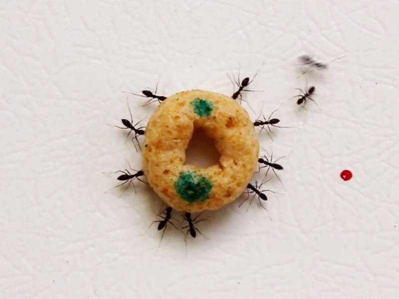 螞蟻在搬運大型食物時,會來來回回調整方向,時不時又有新的螞蟻加入或退出的景象。根據以色列魏茨曼科學研究院發表在《自然通訊》期刊的研究,研究員針對一群螞蟻搬運一顆甜甜圈狀的早餐麥片進行錄影觀察,發現有些螞蟻在中途會放手,並由新螞蟻來取代牠的位置,這時新螞蟻會控制隊伍的行徑方向,朝蟻窩前進約10至20秒後,再交由其他新進螞蟻接手控制。