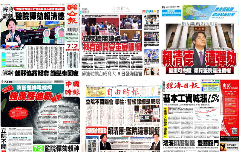 【台灣醒報記者余祥報導】台南市長賴清德拒進議會遭彈劾成為《蘋果日報》、《自由時報》、《聯合報》5日頭版頭條。另外,立院為新課綱協商候,建議教育部開會重審課綱則是《台灣醒報》頭版頭條,報導指出,立法院朝野兩黨4日為新課綱進行談話會,會後決議建議教育部啟動學校課程審議會重新檢討課綱,並由各校自由選擇教科書。