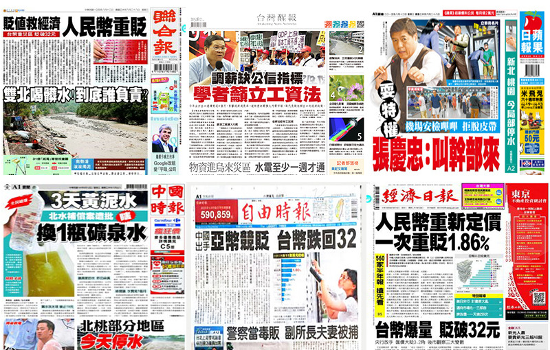 《自由時報》頭條則指出,中國央行無預警讓人民幣中間價一次性重貶近2%,為亞洲匯市投下震撼彈,同時宣告中國正式加入亞幣競貶行列。台灣匯市11日受此衝擊,一舉改寫3大波段紀錄,各銀行外匯交易室幾乎是亂成一團。