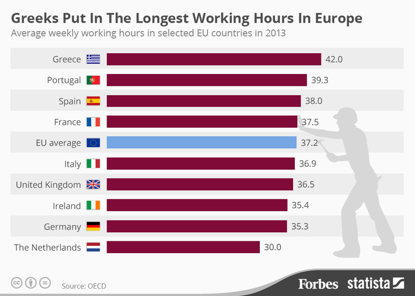 若希臘人懶惰,工時應低於歐洲平均工時才對。然而,長期關注經濟發展、社會福利的跨國組織「經濟合作暨發展組織」(OECD)調查其成員國的工時,2015的結果顯示,希臘人的工時一年共計為2037小時,竟為歐盟之冠,高居所有成員國的第3名!