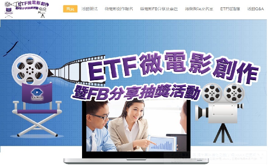 為了讓投資人更了解ETF商品,證交所舉辦「104年度ETF微電影創作徵選暨FB分享抽獎」。想一圓導演夢的人要注意了,若微電影作品在所有參賽作品(不分學生、社會組)中被評選最高榮譽「金質獎」,就可獲獎金30萬元;「銀質獎」社會組、學生組各1位得獎人,獎項分別為12、8萬元。