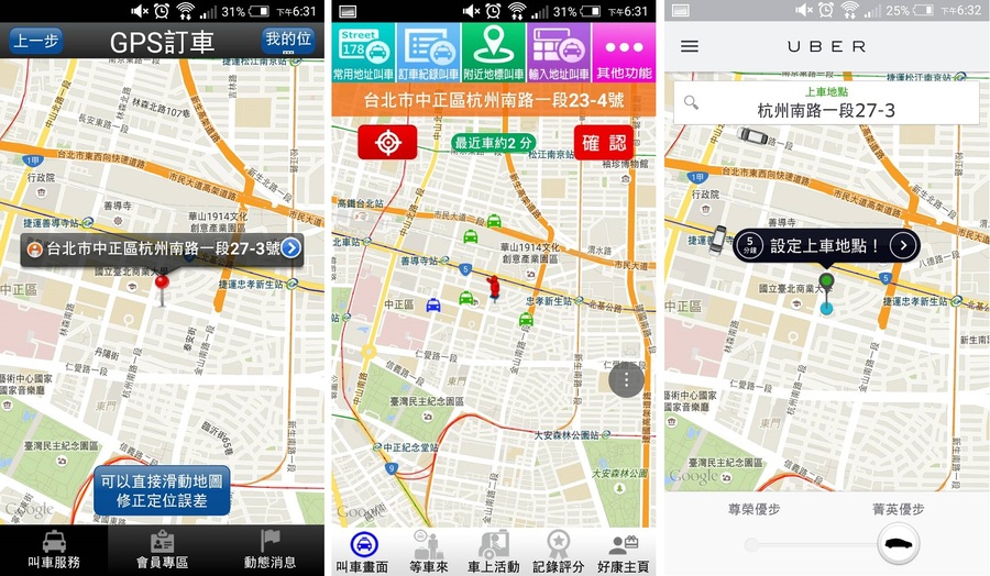 台灣大車隊App和大都會車隊的「178叫車」都有GPS定位和輸入地址叫車、可追蹤司機位置、查詢歷史紀錄及累積紅利點數換購商品等服務,台灣大車隊還多了安心簡訊及路線軌跡紀錄服務,也可選擇特殊需求如開行李箱或攜帶輪椅等。Uber沒有累積紅利點數,但多了預估車資、車資平分及預計抵達時間等功能,且有車輛分級制度。