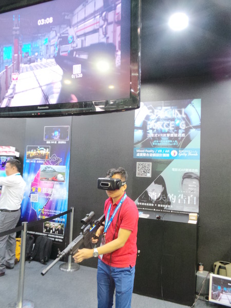 而在「跨域互動娛樂體驗展」部分,最受矚目的便是宏達電即將推出的HTC Vive的虛擬實境機(VR),吸引現場民眾與廠商爭相體驗。除了硬體,旁邊也有許多廠商與學校因應虛擬實境所設計的生活、娛樂服務,像是戴上VR即可模擬在阿里山鐵道騎腳踏車的樂活,以及搭配玩具槍進行的全景射擊遊戲。