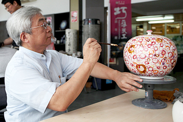 鐘有輝、林雪卿夫婦在台灣版畫領域舉足輕重,是台灣當代版畫發展與推廣的推手。近期二人將創作的領域延伸到「陶器」上,作品包括〈福氣連連三角瓶〉、〈飛躍三角瓶〉等等,將原先的繪畫手法,運用在陶瓷上,賦予畫作生命力與新鮮感。