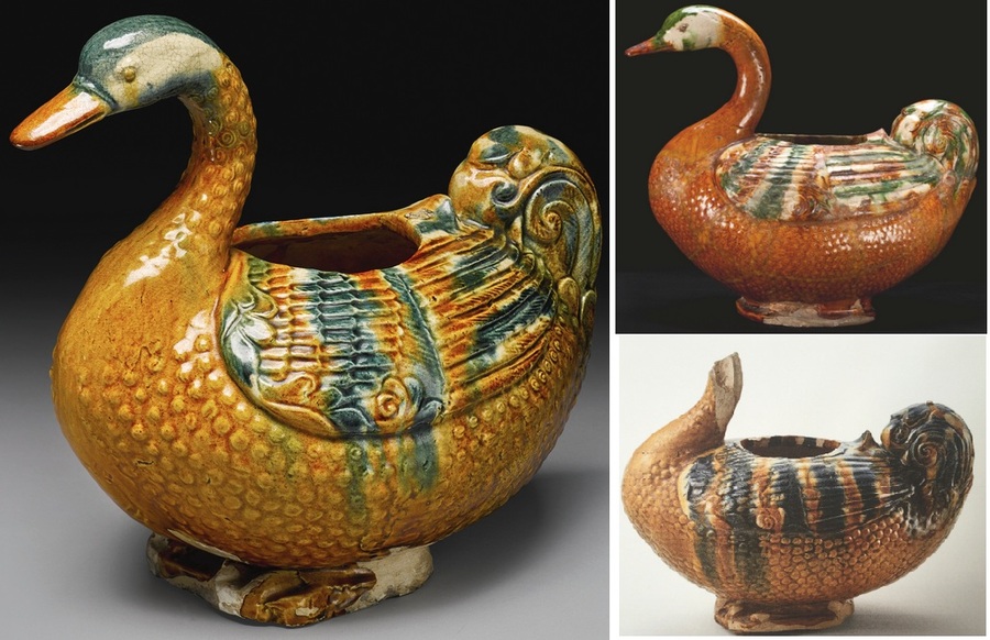 根據蘇富比拍賣的資料,舊金山亞洲藝術博物館收藏一件幾乎相同的藝術品,另在芝加哥博物館(Art Institute of Chicago),及河南省博物館的三彩鴛鴦,但此3件作品主體釉色都爲褐色,且沒有藍彩。另河南鞏義市(前鞏縣)窰址曾出土一件幾乎相同的三彩鵝,但頭頸部殘缺。