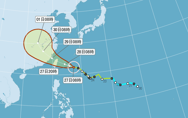 吳依帆表示,「27日北台灣雨量偏多,賞月的機率偏小,但中南部的機率就大一點。」他也強調,「預計中心登陸台灣的時間為28日晚間,會從宜蘭或是花蓮登錄,預計28日入夜到29日凌晨會通過台灣上空,為影響台灣最劇烈的時刻。」氣象局也提醒,台灣東北部海面、台灣東南部海面及離島地區、台灣北部海面及巴士海峽,航行及作業船隻應嚴加戒備。