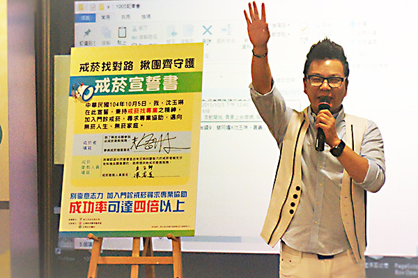 在眾人見證下,沈玉琳簽下「戒菸宣誓書」。他說,因為抽菸漸漸變成不受歡迎的行為,「當身旁的菸友變少時,抽菸反而變成不自在的事」,希望在場醫師、網友及路人朋友,都能一同監督,讓他早日戒菸成功。