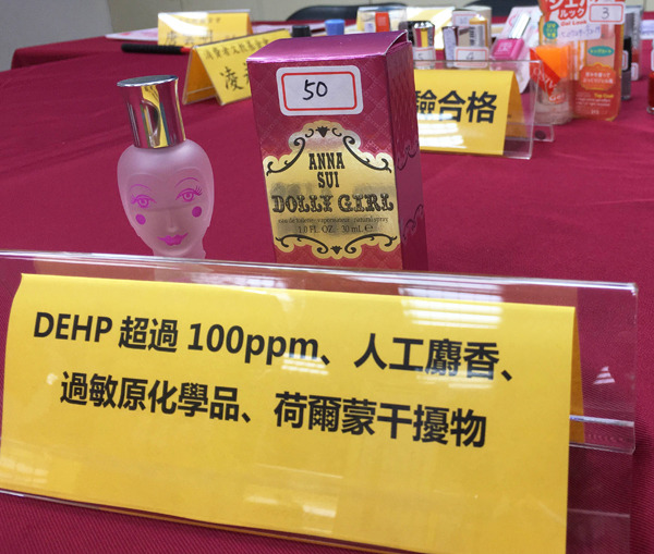 消基會表示,「DEP雖毒性較DEHP低,但仍屬1級毒物,不易被分解且容易蓄積在人體中。」這次化驗總共有11件香水被驗出含有塑化劑,其中8件含DEP,3件含有DEHP。「THE FACE SHOP 靈魂記憶香水甜蜜倩語」、「3464祕密情人香水100mL(金)」,含DEHP20到30ppm,而洋娃娃淡香水則超過法定標準100ppm。