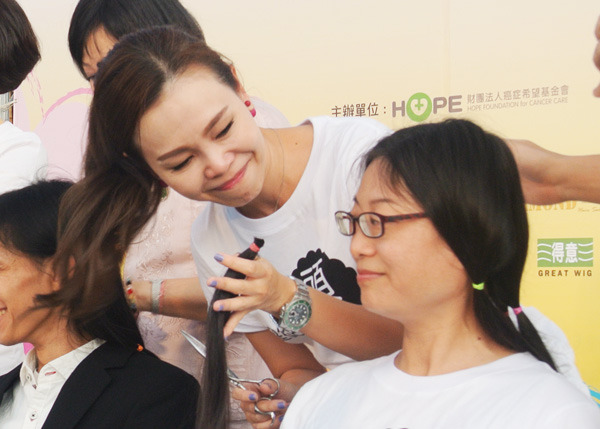 癌症希望基金會25日在台北市圓山花博館內舉行「希望從頭開始!百人攜手捐髮獻愛」活動,活動會場聚集了110多位捐髮者,年齡從9歲多的小妹妹到40幾歲的成年人都有。主持人表示,台灣每年約有10萬人因化療的副作用而掉髮,但每頂假髮需要5-8束未染燙的真髮,而且每頂假髮至少都要花上3000元不等。