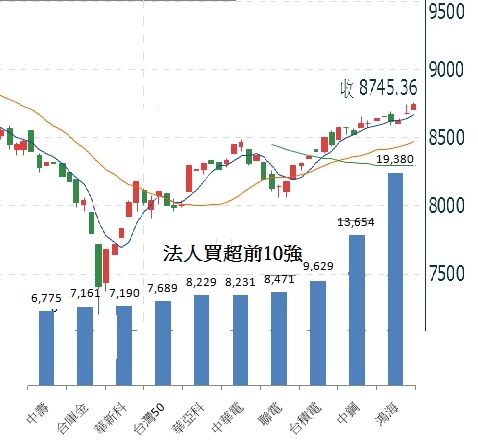其餘買超第6到8名為華亞科、台灣50指數及華新科。第9到17名中除了台塑以外,大多數為金融股如合庫、中壽、永豐金、彰銀、玉山金、台新金等。同樣是金融股,開發金、新光金、中信金、兆豐金卻遭到法人棄守,外資賣超在8900張到4600張之間。