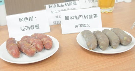 記者會現場的展示台上擺放著兩盤顏色不同的香腸,其中一盤是添加亞硝酸鹽的香腸,呈現鮮紅的顏色,另一盤則是無添加物,呈現深咖啡色。高怡婷表示,「並不是說香腸一定要加入亞硝酸鹽,其實長時間的低溫保存也是可以,但是這就必須確保在運送過程中,溫度能一直維持低溫狀態,才不會產生細菌。」