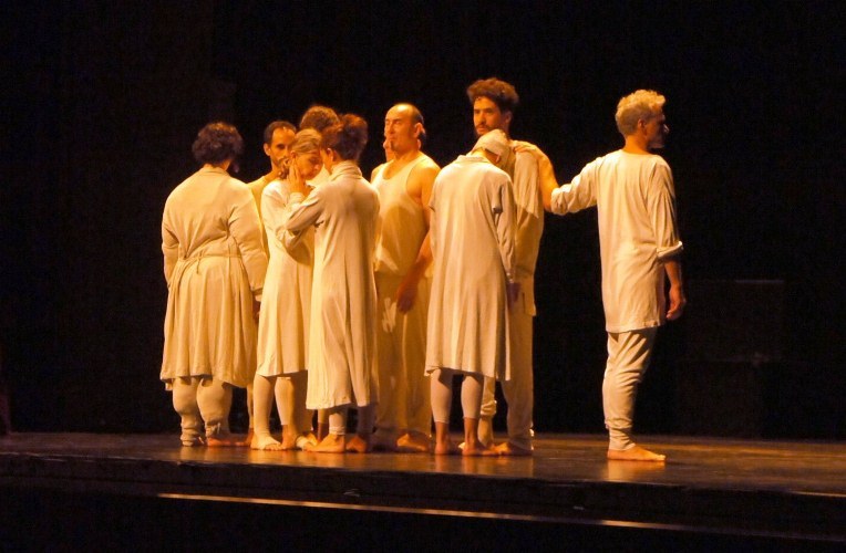 在法國瑪姬‧瑪和舞團的作品《May B》中,穿著一身灰白的舞者,用僵直誇張的肢體,演繹行屍走肉般的眾生。(photo by 黃譯萱/台灣醒報)