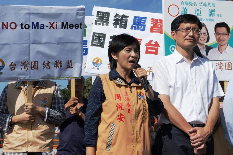 【台灣醒報記者黃譯萱台北報導】「黑箱馬習會,國共賣台會!」台聯黨5日上午到總統府前抗議,台聯立委周倪安怒批,馬習會將在雙方酒酣耳熱之際,將人民主權給「喝掉」,而台聯立委參選人蕭亞譚也指出,馬英九即將卸任,代表的是舊民意,他呼籲民眾及記者碰到馬英九時都質問他,「你究竟代表誰進行馬習會?」