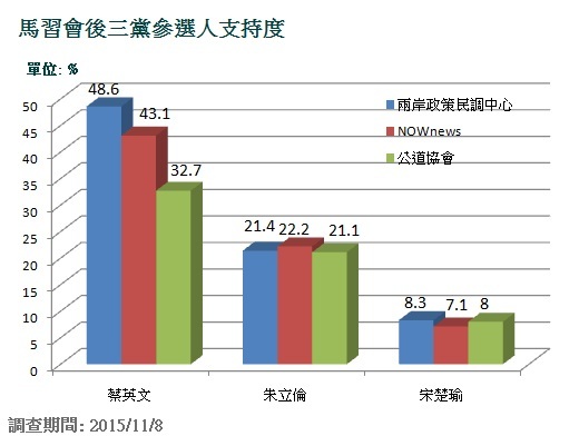 被外界視為立場較傾綠的兩岸政策協會,以及立場較傾藍的公道協會在9日同步發表馬習會後的三黨總統參選人支持度民調,民進黨總統參選人蔡英文領先姿態不變,但是在政策協會的調查當中,蔡英文以48.6%領先國民黨總統參選人朱立倫的21.4%,雙方差距拉開到17.2%。在公道協會的民調當中,蔡英文卻僅以32.7% 領先朱立倫的21.1%。