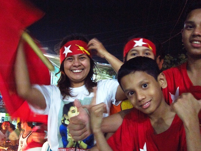 即便正式結果尚未出爐,NLD支持者已陷入瘋狂,他們穿著象徵NLD的紅衣,綁著「We Must Win」的紅布條,在臉上畫上油彩、揮舞黨旗,大肆慶祝即將到來的勝利。「政府還未正式公布,但百分之百是NLD贏,」一名36歲的男子興奮地說,「看看這些人群就知道!」
